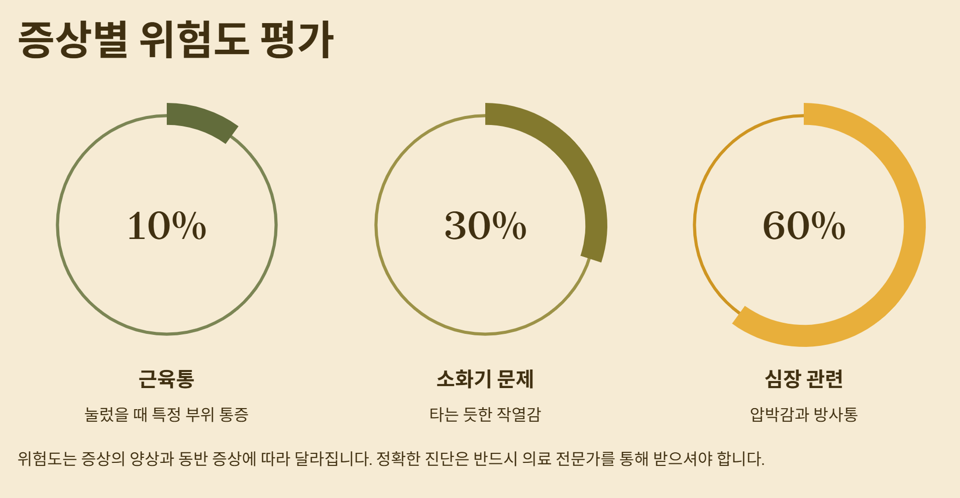 만약 통증의 양상이 단순한 뻐근함을 넘어선다면 조금 더 주의 깊게 살펴야 합니다. 심장은 우리 생명과 직결되는 만큼 초기 대응이 무엇보다 중요하니까요.