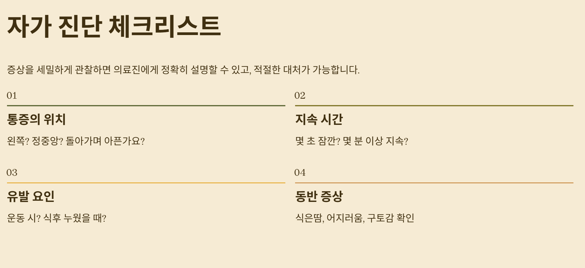 - 유발 요인: 운동할 때 아픈지, 아니면 밥 먹고 누웠을 때 아픈지 확인해 보세요.