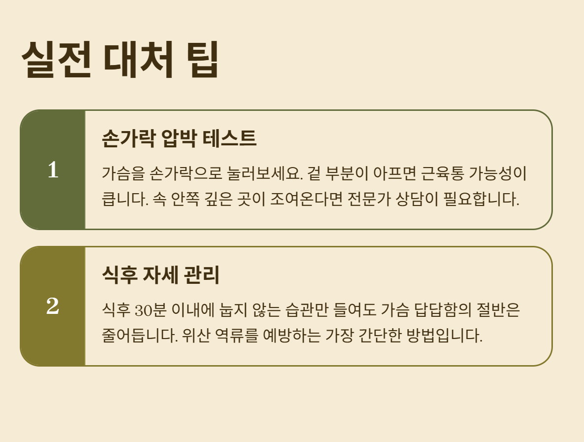 실전 팁 하나! 통증이 올 때 손가락으로 가슴을 눌러보세요. 겉 부분이 아프다면 근육통일 가능성이 크지만, 속 안쪽 깊은 곳이 조여온다면 전문가를 찾는 게 맞습니다. 실전 팁 둘! 평소 식후 30분 이내에 눕지 않는 습관만 들여도 가슴 답답함의 절반은 줄어듭니다.