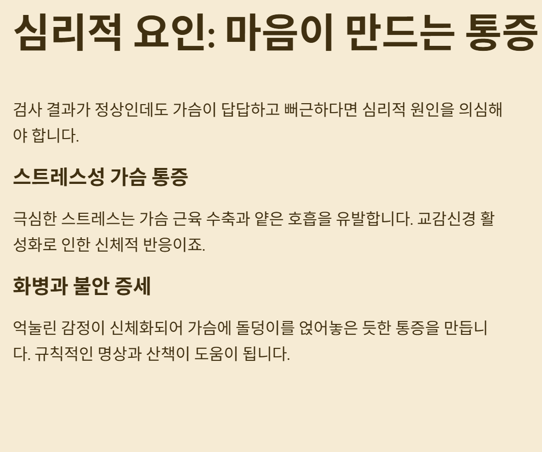 극심한 스트레스를 받으면 우리 몸은 긴장 상태에 돌입합니다. 이때 가슴 근육이 수축하고 호흡이 얕아지면서 뻐근한 느낌을 받게 되죠. "가슴이 답답해서 한숨이 자꾸 나요"라고 말씀하시는 분들이 여기에 해당합니다. 마음이 불안할 때 교감신경이 활성화되면서 나타나는 지극히 신체적인 반응인 셈이죠.