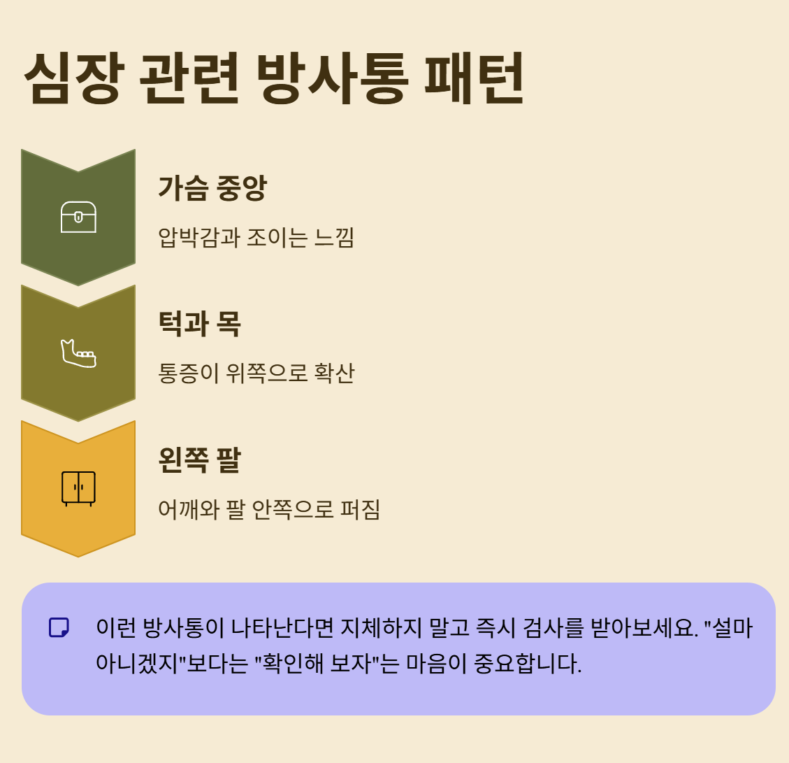 가슴만 아픈 게 아니라 턱, 목, 왼쪽 어깨나 팔 안쪽으로 통증이 퍼져 나간다면 이는 전형적인 심장 관련 방사통일 수 있습니다. 이런 경우에는 지체하지 말고 검사를 받아보시는 것이 안전해요. 저도 주변 어르신들께 늘 말씀드리는 부분인데, "설마 아니겠지" 하는 마음보다는 "확인해 보자"는 마음이 중요하더라고요.