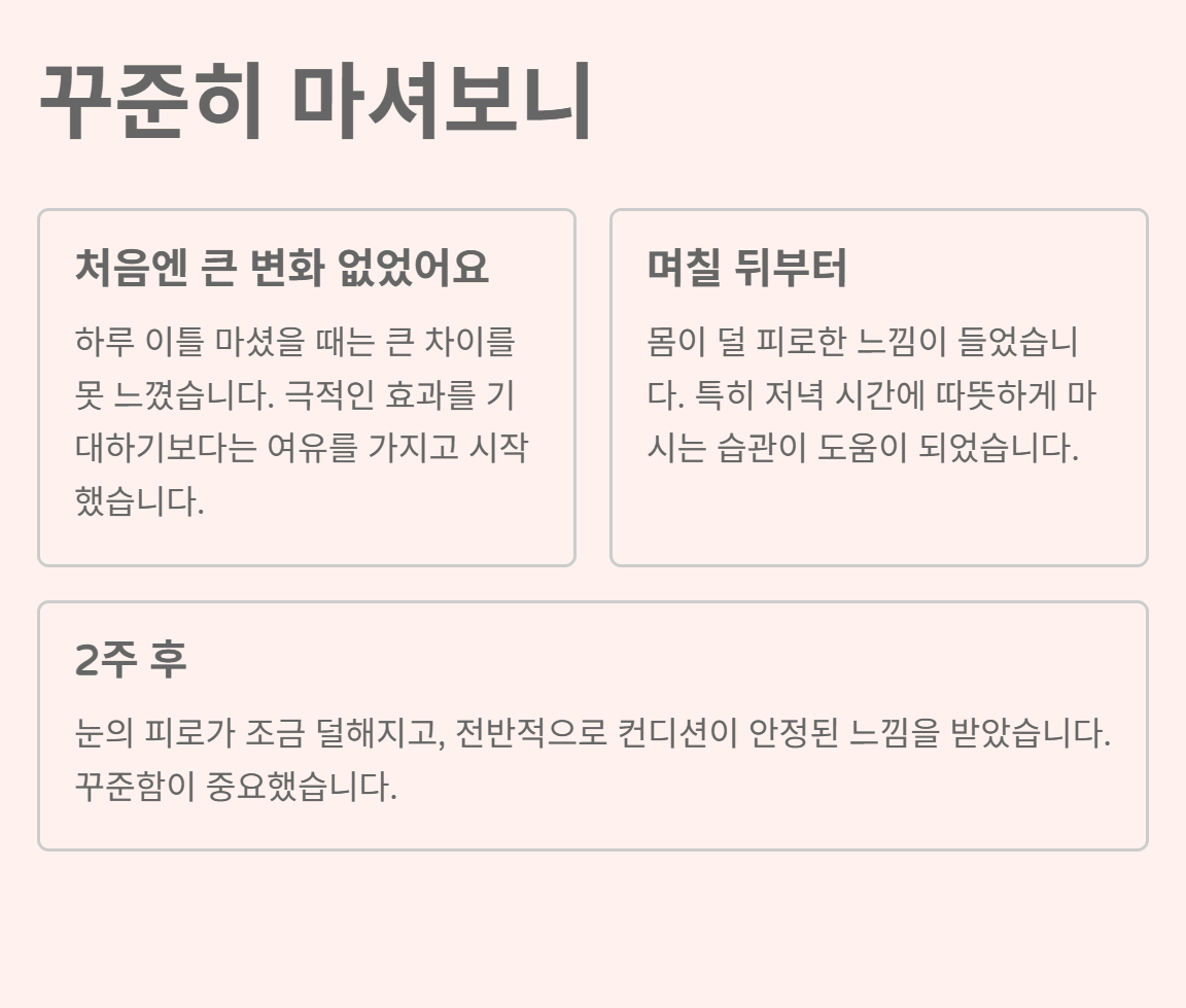 하루 이틀 마셨을 때는 큰 차이를 못 느꼈지만, 며칠 꾸준히 마시니 몸이 덜 피로한 느낌이 들었습니다. 특히 저녁 시간에 따뜻하게 마시는 습관이 도움이 되었습니다.