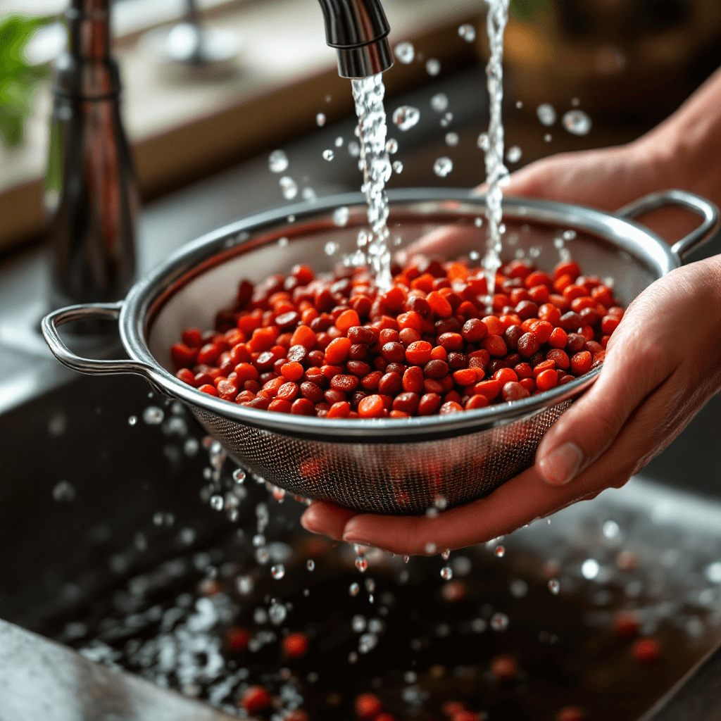 구기자는 물에 오래 담가두면 영양 성분이 빠질 수 있어서, 저는 체에 담아 흐르는 물에 빠르게 한 번 헹궈 사용했습니다. 이 과정만으로도 이물감은 충분히 제거되었습니다.