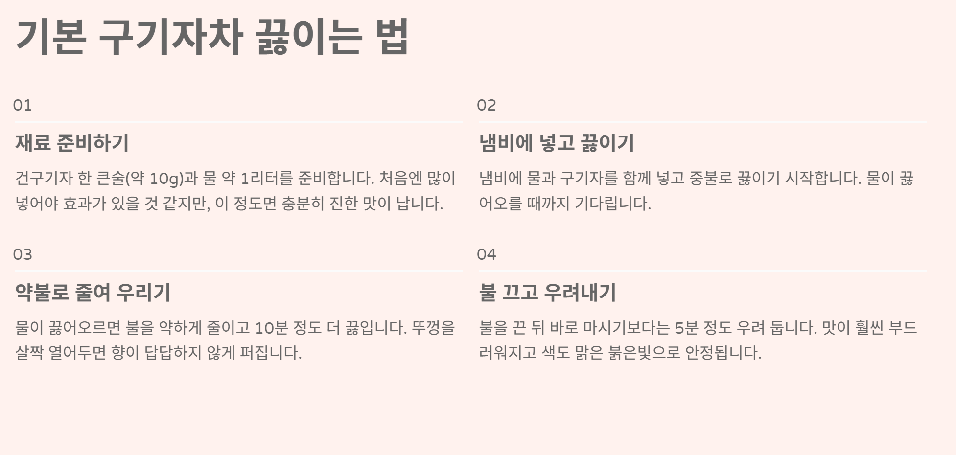 구기자차 끓이는법은 생각보다 어렵지 않았습니다. 몇 번만 직접 끓여보면 자신만의 비율과 방법이 자연스럽게 생겼습니다. 바쁜 일상 속에서도 따뜻한 차 한 잔으로 몸을 돌보는 시간이 생겼다는 점이 가장 좋았습니다.