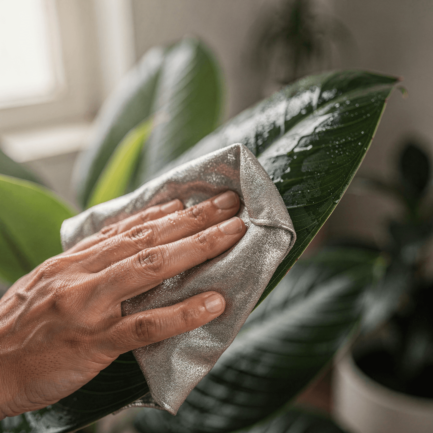 잎이 두껍고 넓어 먼지가 쉽게 쌓이기 때문에, 가끔 젖은 천으로 닦아주면 광택이 살아나고 전체적으로 훨씬 건강해 보였습니다. 잎을 닦아주는 과정에서 상태를 함께 확인할 수 있어 관리에도 도움이 되었습니다.