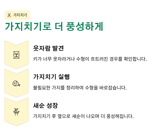 키가 너무 웃자라거나 수형이 흐트러질 경우 가지치기를 해줄 수 있습니다. 가지치기 후에는 옆으로 새순이 나오는 경우가 많아 더 풍성해지는 느낌도 있었습니다.