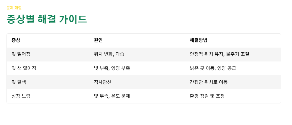 - 잎이 떨어질 때: 갑작스러운 위치 변화나 과습이 원인인 경우가 많았습니다.