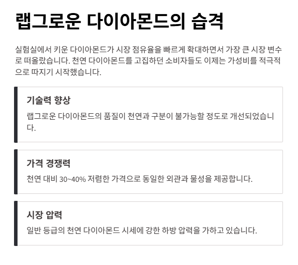 - 현재 시세: 천연 다이아몬드는 고품질 위주로 가격을 방어 중이며, 일반 등급은 랩그로운의 영향으로 약보합세입니다.
