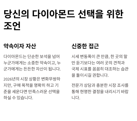 다이아몬드는 단순한 보석을 넘어 누군가에게는 소중한 약속이고, 누군가에게는 든든한 자산이 되기도 하죠. 2026년의 시장 상황은 변화무쌍하지만, 내가 어떤 목적으로 구매하는지 명확히 기준을 세운다면 분명 만족스러운 선택을 하실 수 있을 겁니다.