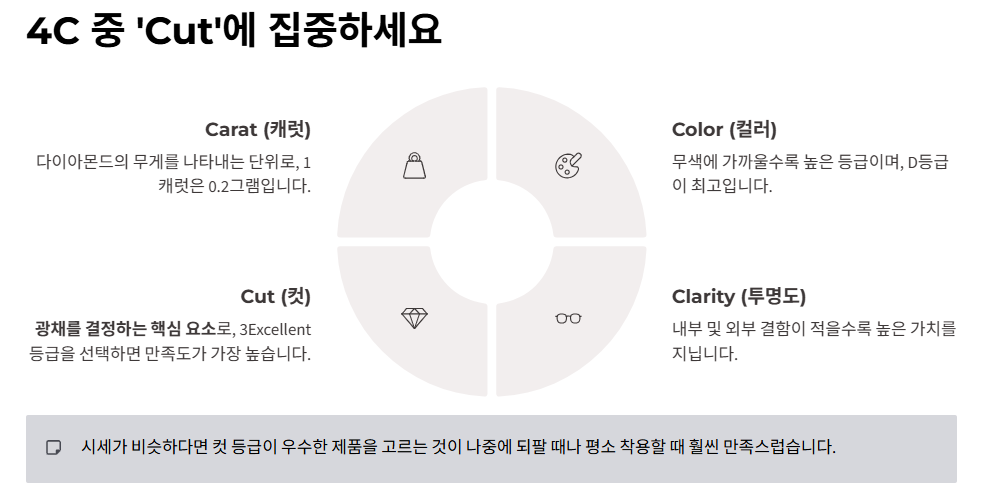 캐럿(Carat), 컬러(Color), 투명도(Clarity)도 중요하지만, 다이아몬드의 광채를 결정하는 건 결국 **컷(Cut)**입니다. 시세가 비슷하다면 컷 등급이 '3Excellent'인 제품을 고르는 것이 나중에 되팔 때나 평소 착용할 때 만족도가 훨씬 높았습니다.