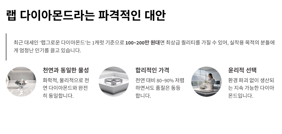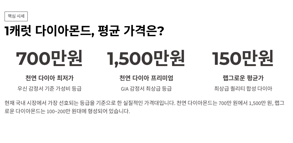 만약 예산이 타이트하다면 최근 대세인 '랩그로운 다이아몬드'를 눈여겨보세요. 1캐럿 기준으로 100~200만 원대면 최상급 퀄리티를 가질 수 있어, 실착용 목적의 분들에게는 엄청난 인기를 끌고 있습니다.