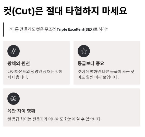 제가 현장에서 배운 가장 큰 팁은 "다른 건 몰라도 컷은 무조건 'Triple Excellent(3EX)'로 하라"는 것입니다. 다이아몬드의 생명인 광채는 컷에서 나오기 때문에, 등급이 조금 낮아도 컷이 완벽하면 훨씬 비싸 보인답니다.