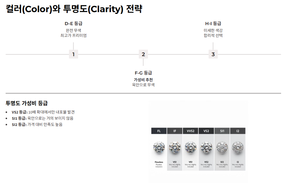 완전 무색인 D등급이 가장 비싸지만, 전문가들은 가성비 등급으로 F~G 컬러를 많이 추천합니다. 투명도 역시 SI1~VS2 등급 정도면 육안으로는 내포물이 거의 보이지 않아 가격 대비 만족도가 매우 높았어요.