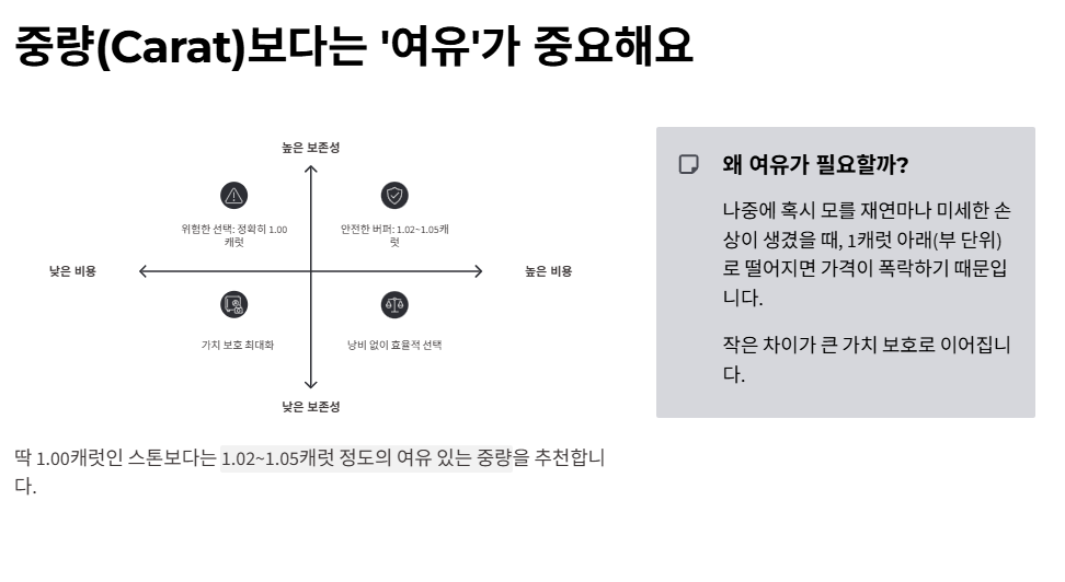딱 1.00캐럿인 스톤보다는 1.02~1.05캐럿 정도의 여유 있는 중량을 추천합니다. 나중에 혹시 모를 재연마나 미세한 손상이 생겼을 때, 1캐럿 아래(부 단위)로 떨어지면 가격이 폭락하기 때문이에요.