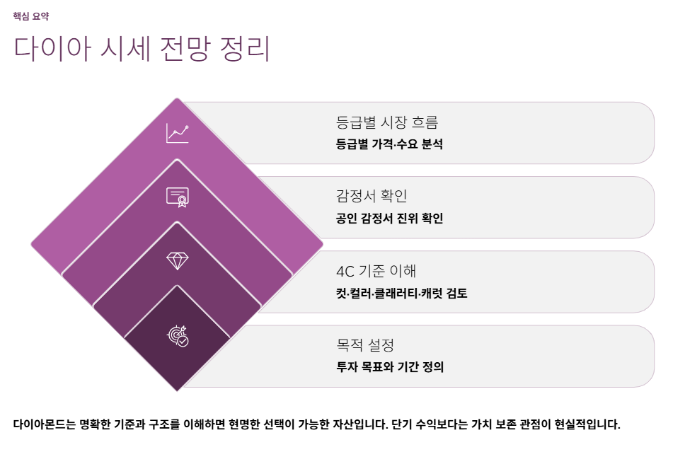 다이아는 숫자만 보고 판단하기 어려운 자산이라는 점을 직접 비교하면서 느꼈습니다. 시세 전망을 볼 때도 단순한 상승 기대보다는 구조와 등급을 먼저 살펴보는 습관이 훨씬 도움이 되었습니다. 결국 목적이 예물인지, 소장인지, 가치 보존인지부터 정리하시는 것이 가장 중요한 출발점이라고 생각합니다.