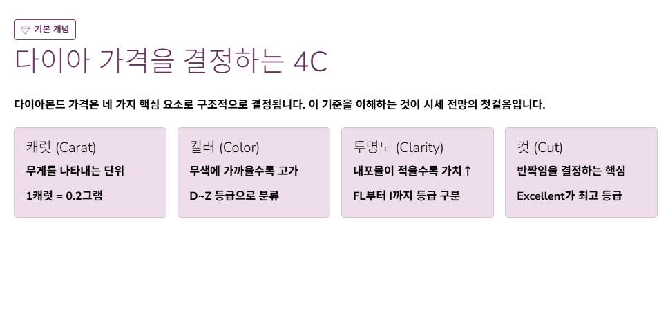 다이아 가격은 4C에 따라 구조적으로 결정된다는 점을 이해하는 것이 먼저입니다.