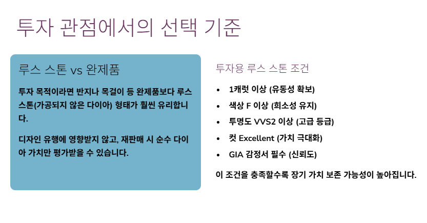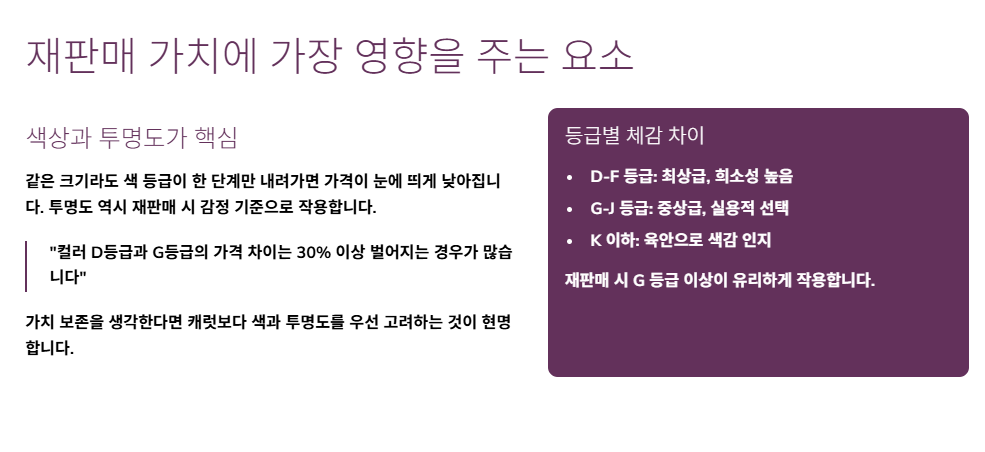 재판매나 가치 보존을 생각하신다면 색과 투명도가 특히 중요하다고 느꼈습니다. 같은 크기라도 색 등급이 한 단계만 내려가도 가격이 눈에 띄게 낮아지는 경우를 실제로 확인했습니다.