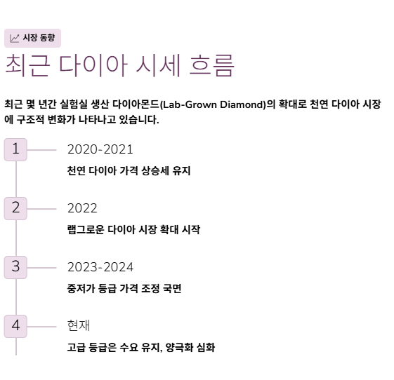 최근 몇 년 사이 실험실에서 생산한 다이아몬드가 늘어나면서, 천연 다이아 가격이 예전처럼 강하게 오르지 못하는 모습도 보였습니다. 매장 상담을 받을 때도 전반적으로 신중해진 분위기를 느꼈습니다.