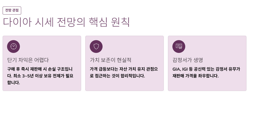 다이아몬드는 단기 차익을 노리는 자산과는 거리가 있다는 점을 여러 사례를 통해 알게 되었습니다. 구매 후 바로 되팔 경우 손해를 보는 구조라는 이야기가 괜히 나온 것이 아니었습니다.