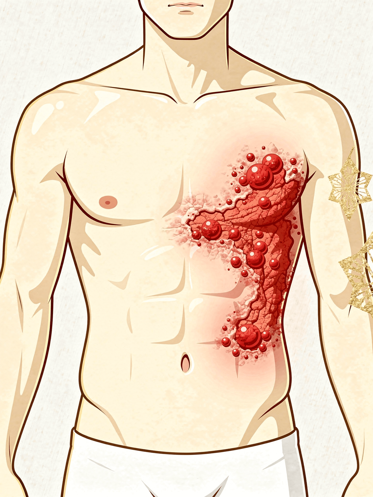 전조증상이 지나면 신경 라인을 따라 붉은 반점과 함께 작은 물집들이 '띠 모양'으로 무리 지어 나타납니다. 우리 몸의 신경은 척추를 중심으로 좌우로 나뉘어 있기 때문에, 대상포진은 대개 몸의 한쪽(오른쪽 혹은 왼쪽)에만 국한되어 나타나는 아주 독특한 특징이 있어요. 양쪽으로 다 나타나는 경우는 극히 드뭅니다.