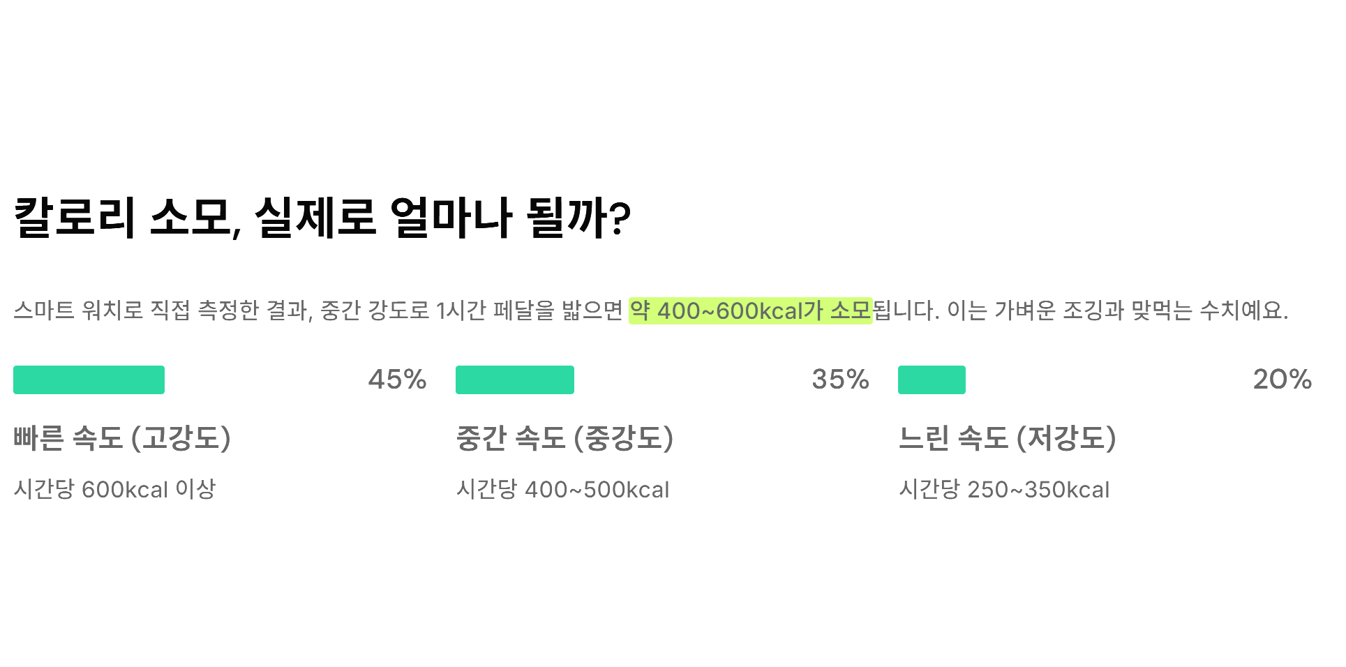 - 고강도: 1분간 숨이 찰 정도로 아주 빠르게 페달을 굴립니다.