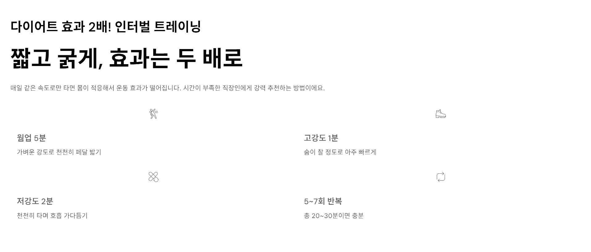 이렇게 타면 일반적인 강도로 1시간 타는 것보다 훨씬 짧은 시간에 더 많은 지방을 태울 수 있습니다. 시간이 부족한 직장인분들에게 제가 적극적으로 추천하는 방식이에요.