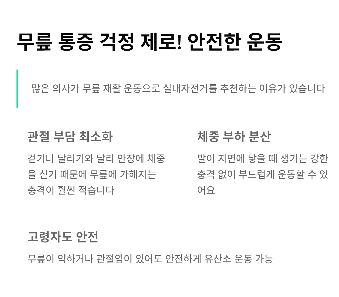 많은 의사분이 무릎 재활 운동으로 실내자전거를 추천하는 이유가 있습니다. 걷기나 달리기는 발이 지면에 닿을 때 체중의 몇 배에 달하는 충격이 무릎에 전달되지만, 자전거는 안장에 체중을 싣기 때문에 관절에 가해지는 부담이 훨씬 적기 때문이죠.
