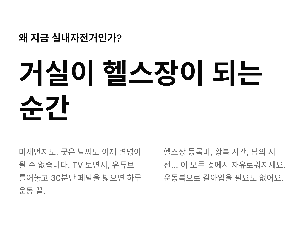 밖으로 나가는 번거로움 없이 집안에서 건강한 땀방울을 흘리다 보면, 어느새 몰라보게 가벼워진 몸과 마음을 만나게 되실 거예요. 오늘부터 딱 20분만 페달을 밟아보시는 건 어떨까요?