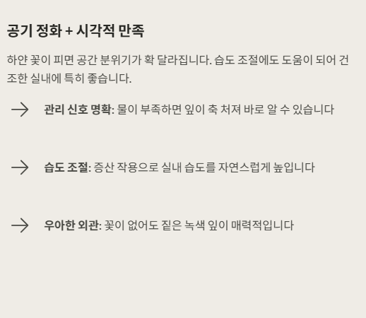 스파티필룸은 공기 정화 효과뿐 아니라 시각적인 만족감이 큰 식물이었습니다. 하얀 꽃이 피면 공간 분위기가 확 달라졌고, 습도 조절에도 도움이 된다고 느꼈습니다.