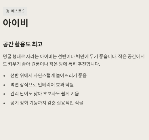 아이비는 공간 활용도가 뛰어난 식물이었습니다. 선반이나 벽면에 두기 좋고, 덩굴 형태로 자라 인테리어 효과가 컸습니다. 관리가 어렵지 않으면서도 공기 정화에 도움을 준다는 점이 장점으로 느껴졌습니다.