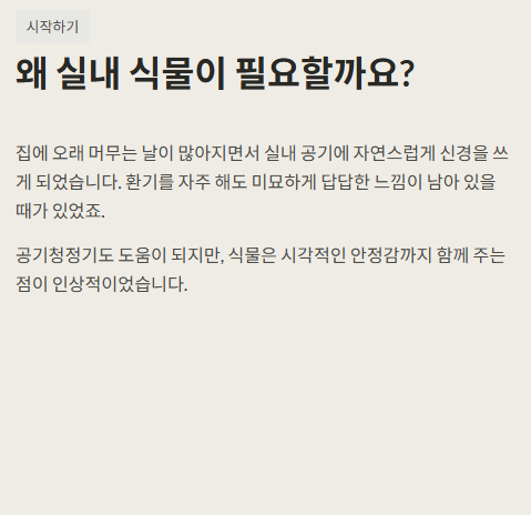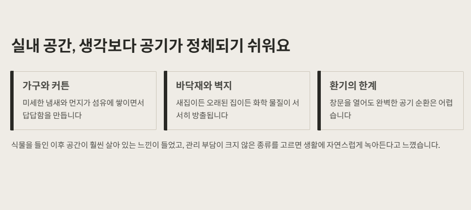 실내 공간은 생각보다 공기가 정체되기 쉽습니다. 가구, 커튼, 바닥재에서 발생하는 미세한 냄새나 먼지가 쌓이면서 답답함을 느끼게 됩니다. 공기청정기도 도움이 되지만, 식물은 시각적인 안정감까지 함께 주는 점이 인상적이었습니다.