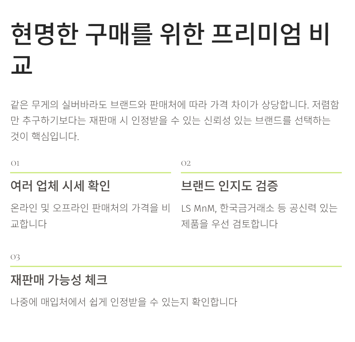 그래서 저는 실버바를 살 때 여러 업체의 '프리미엄'을 꼭 비교해 봅니다. 같은 1kg 실버바라도 브랜드나 판매처에 따라 가격이 몇만 원씩 차이 나기도 하거든요. 너무 저렴한 곳만 찾기보다는 나중에 다시 되팔 때 제값을 받을 수 있는 인지도 있는 브랜드인지 확인하는 것이 훨씬 중요했습니다.