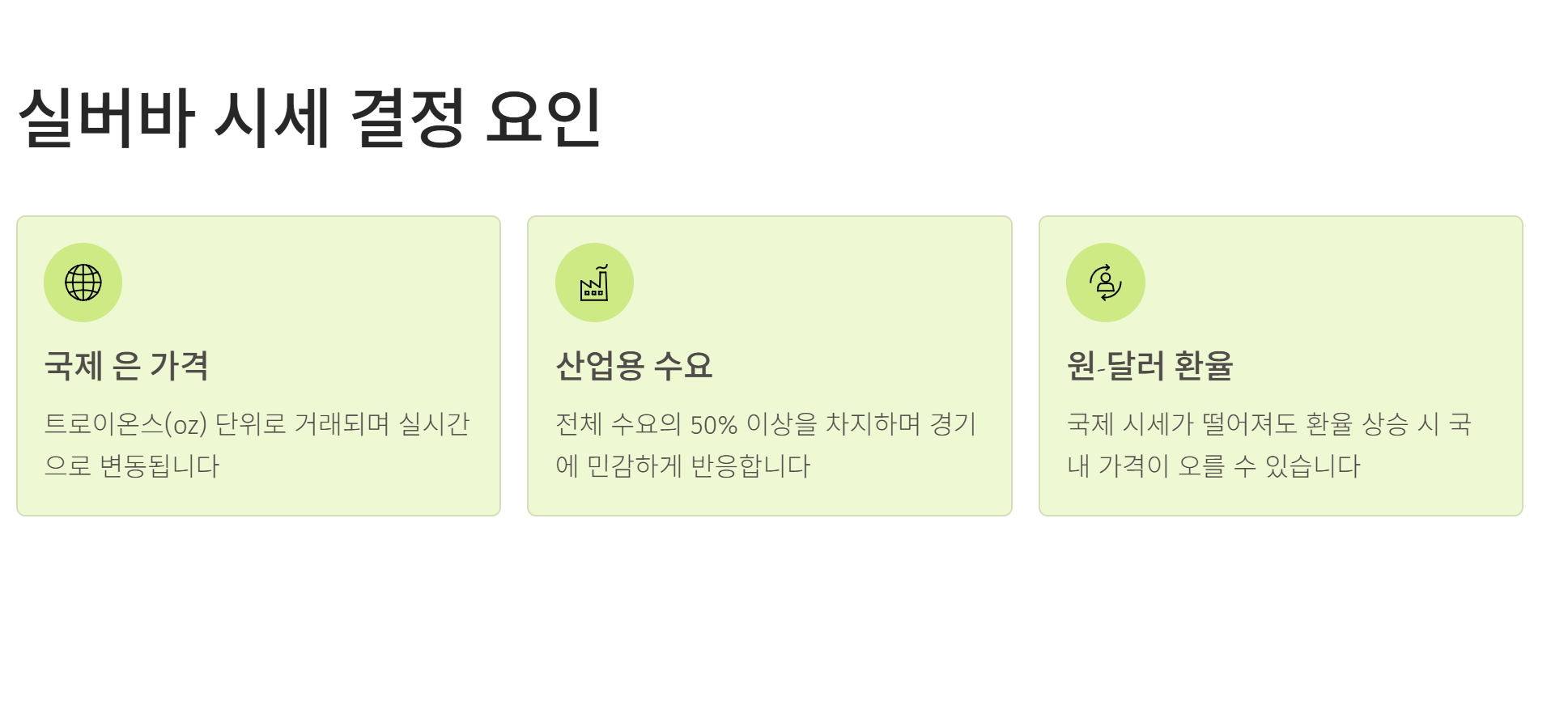 - 국제 은 시세뿐만 아니라 원-달러 환율 변동을 반드시 함께 체크해야 합니다.