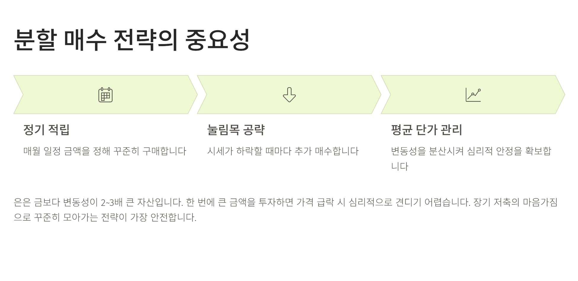저는 한 번에 큰 금액을 투자하기보다는 시세가 눌림목을 형성할 때마다 조금씩 분할 매수하는 방식을 선호합니다. 은은 변동성이 금보다 훨씬 크기 때문에 올인 전략은 심리적으로 견디기 힘들 수 있거든요. 느긋하게 '장기 저축'한다는 마음가짐으로 접근하는 게 실물 은 투자의 핵심인 것 같습니다.