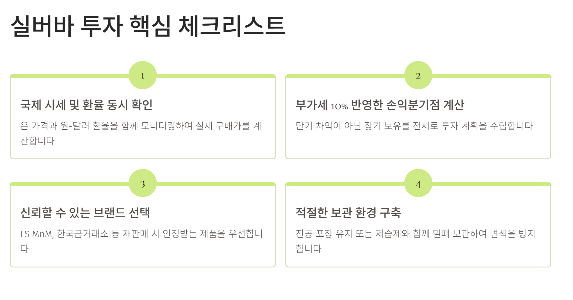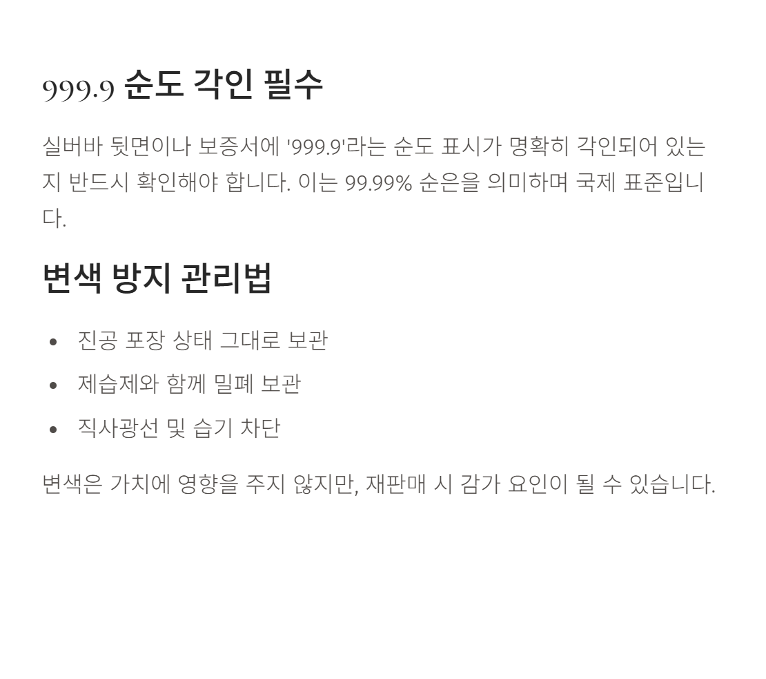- 실물 은은 부가세 10%가 붙으므로 단기 차익보다는 장기 보유에 적합합니다.