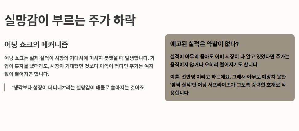 어닝 쇼크는 실제 실적이 시장의 기대치에 미치지 못했을 때 발생합니다. 기업이 흑자를 냈더라도, 시장이 기대했던 것보다 이익이 적다면 주가는 여지없이 떨어지곤 합니다. "생각보다 성장이 더디네?"라는 실망감이 매물로 쏟아지는 것이죠.