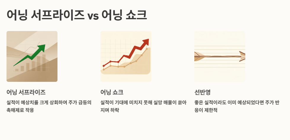 재미있는 점은 실적이 아무리 좋아도 이미 시장이 다 알고 있었다면 주가는 움직이지 않거나 오히려 떨어지기도 합니다. 이를 '선반영'이라고 하는데요. 그래서 아무도 예상치 못한 '깜짝 실적'인 어닝 서프라이즈가 그토록 강력한 호재로 작용하는 이유입니다.