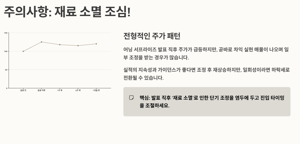 - 주의사항: 일회성 이익인지 확인하고, 발표 직후 '재료 소멸'로 인한 차익 실현 매물이 나오는지 살피세요.