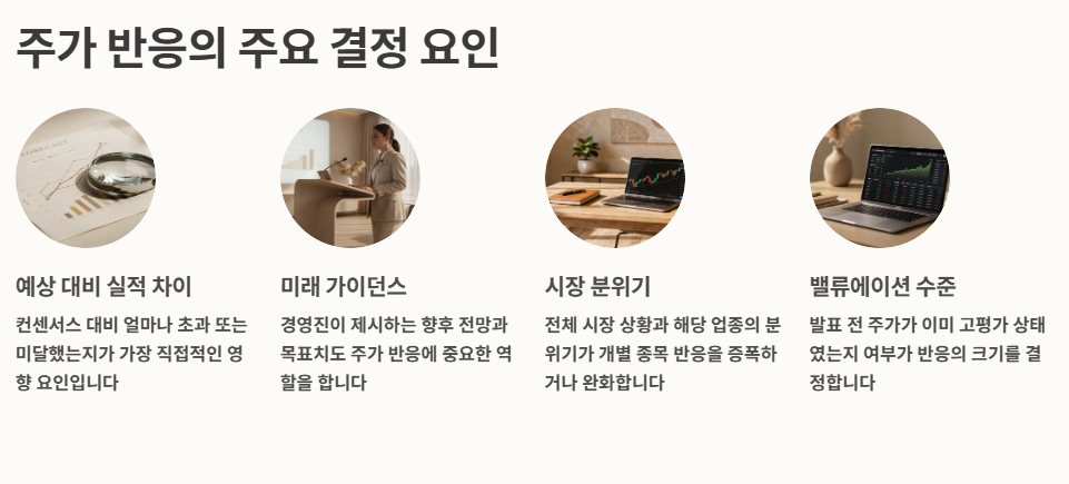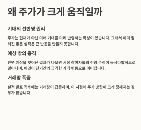 주가는 미래 기대를 미리 반영합니다. 그래서 이미 알고 있던 좋은 실적은 큰 반응이 없고, 예상 밖의 결과가 나올 때 급격한 변동이 생깁니다.