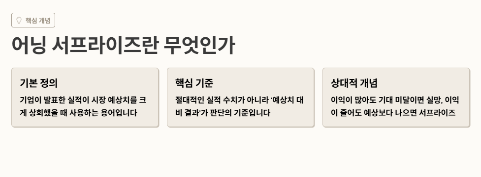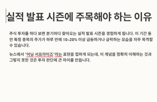 주식 하다 보면 실적 발표 시즌에 갑자기 주가가 급등하는 종목을 보게 됩니다. 뉴스에는 “어닝 서프라이즈”라는 표현이 붙고, 왜 오르는지 궁금해서 저도 여러 번 찾아본 적이 있습니다. 몇 번 경험해보니 이 개념을 알고 보는 것과 모르는 상태는 차이가 크다고 느꼈습니다.