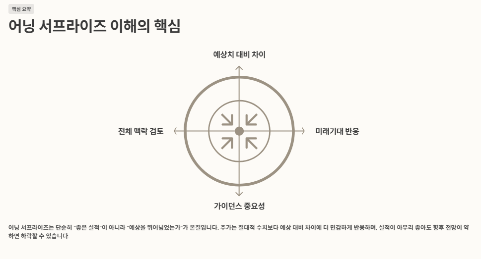 결국 어닝 서프라이즈는 “좋은 실적”이라는 말보다 “예상을 뛰어넘었는가”가 핵심입니다. 실적 시즌에 이런 구조를 이해하고 보면 시장 움직임이 훨씬 논리적으로 보이기 시작합니다.