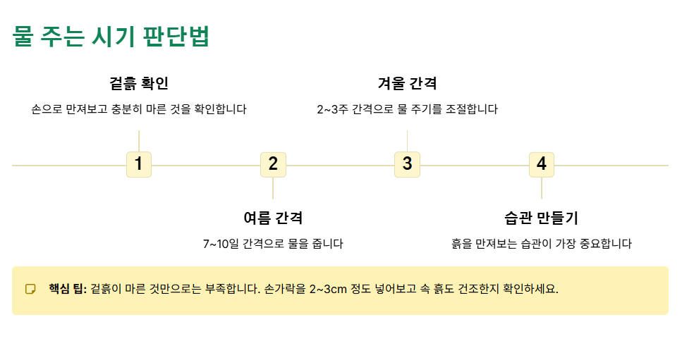 계절에 따라 물 주는 간격이 달라졌는데, 여름에는 7~10일, 겨울에는 2~3주 간격이 적당했습니다. 손으로 흙을 만져보는 습관이 큰 도움이 되었습니다.
