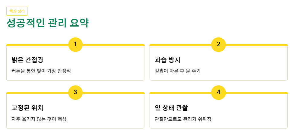 밝은 간접광과 과습을 피하는 물 관리가 핵심이었습니다.