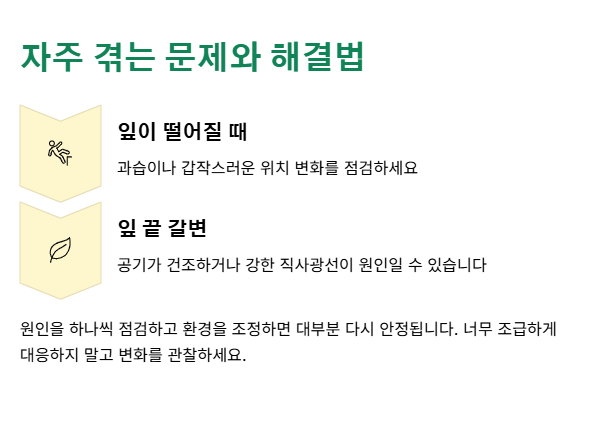- 잎이 떨어질 때: 과습이나 갑작스러운 위치 변화가 원인인 경우가 많았습니다.