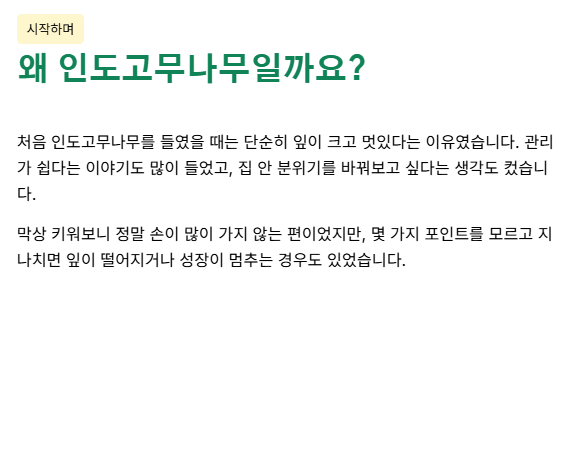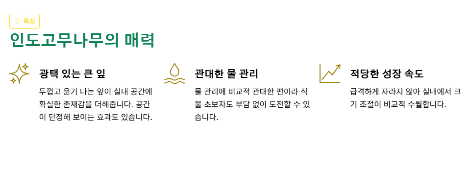인도고무나무를 키우면서 느낀 점은, 많이 해주는 것보다 적당히 기다려주는 관리가 더 중요하다는 사실이었습니다. 물을 줄 타이밍을 재고, 빛과 위치를 안정적으로 유지하는 것만으로도 식물은 충분히 잘 자랐습니다. 초록 잎이 천천히 자라는 모습을 보며 일상에 여유를 더하고 싶다면, 인도고무나무는 부담 없이 시작하기 좋은 선택이라고 생각했습니다.