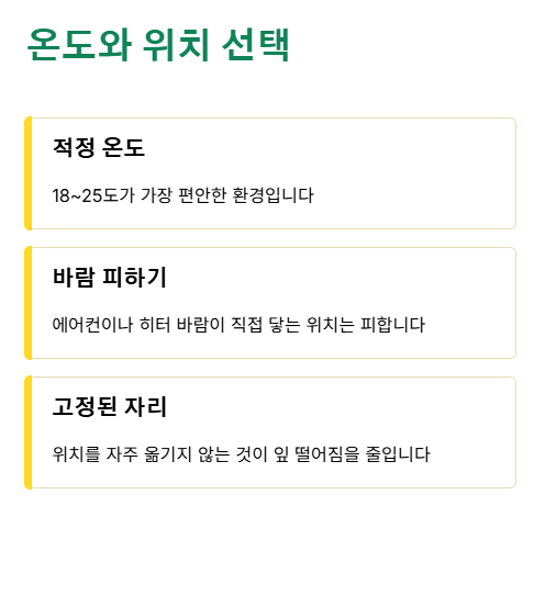 적정 온도는 18~25도 정도가 가장 편안해 보였습니다. 에어컨이나 히터 바람이 직접 닿는 위치는 피했고, 자리를 자주 옮기지 않는 것이 잎 떨어짐을 줄이는 데 도움이 되었습니다.
