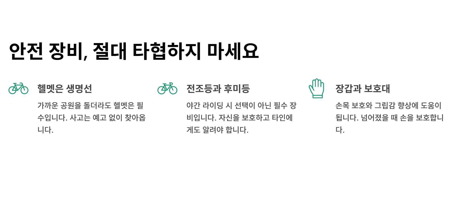 사고는 예고 없이 찾아옵니다. 가까운 공원을 돌더라도 헬멧은 생명선이라고 생각하고 꼭 착용하셔야 합니다. 야간 라이딩을 하신다면 전조등과 후미등은 선택이 아닌 필수입니다.