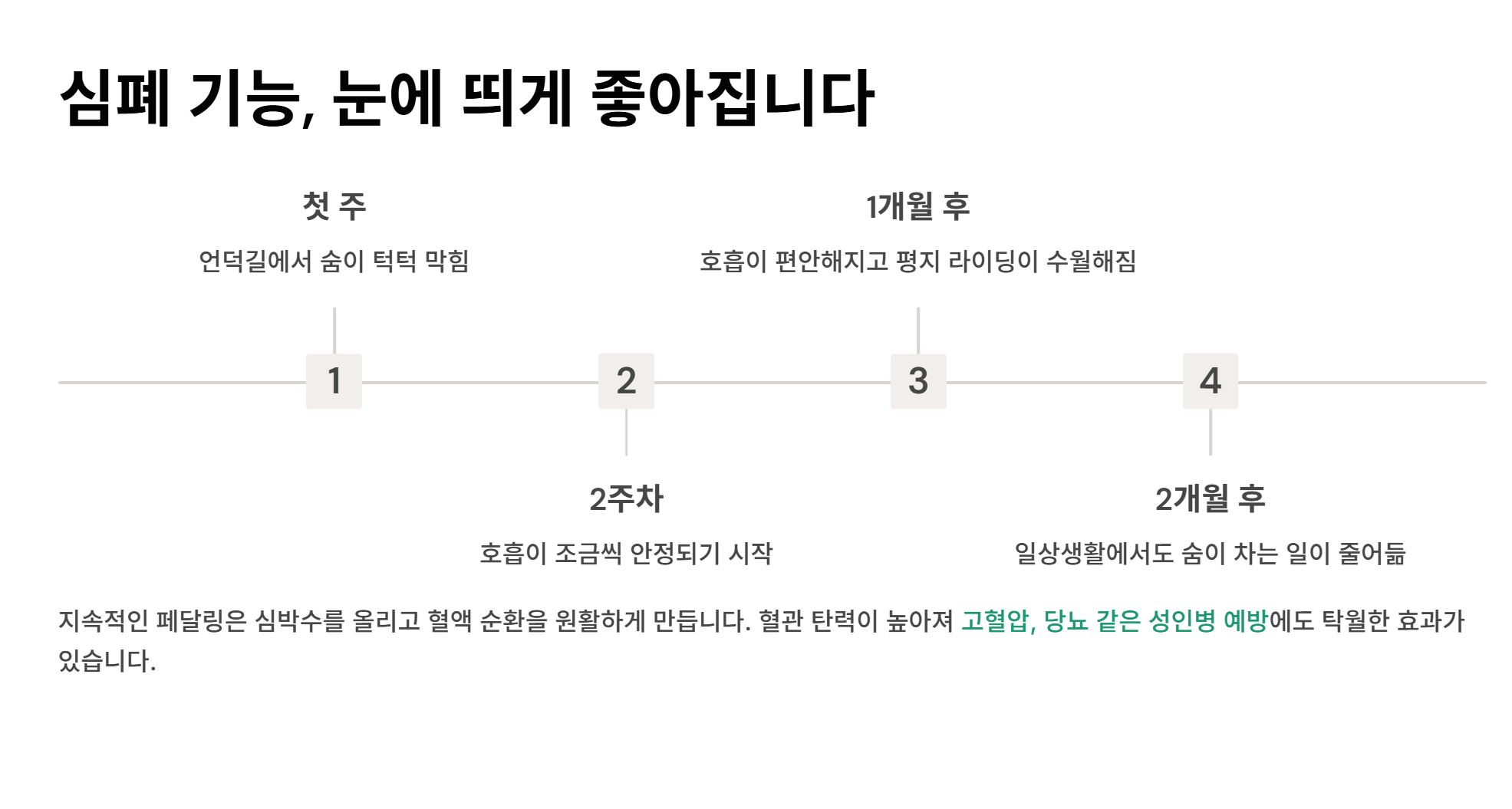 처음에는 언덕길만 만나도 숨이 턱턱 막혔지만, 한 달 정도 지나니 호흡이 안정되고 평소 일상생활에서도 숨이 차는 일이 줄어들더라고요. 이는 혈관 탄력을 높여 고혈압이나 당뇨 같은 성인병 예방에도 아주 탁월한 효과가 있습니다.