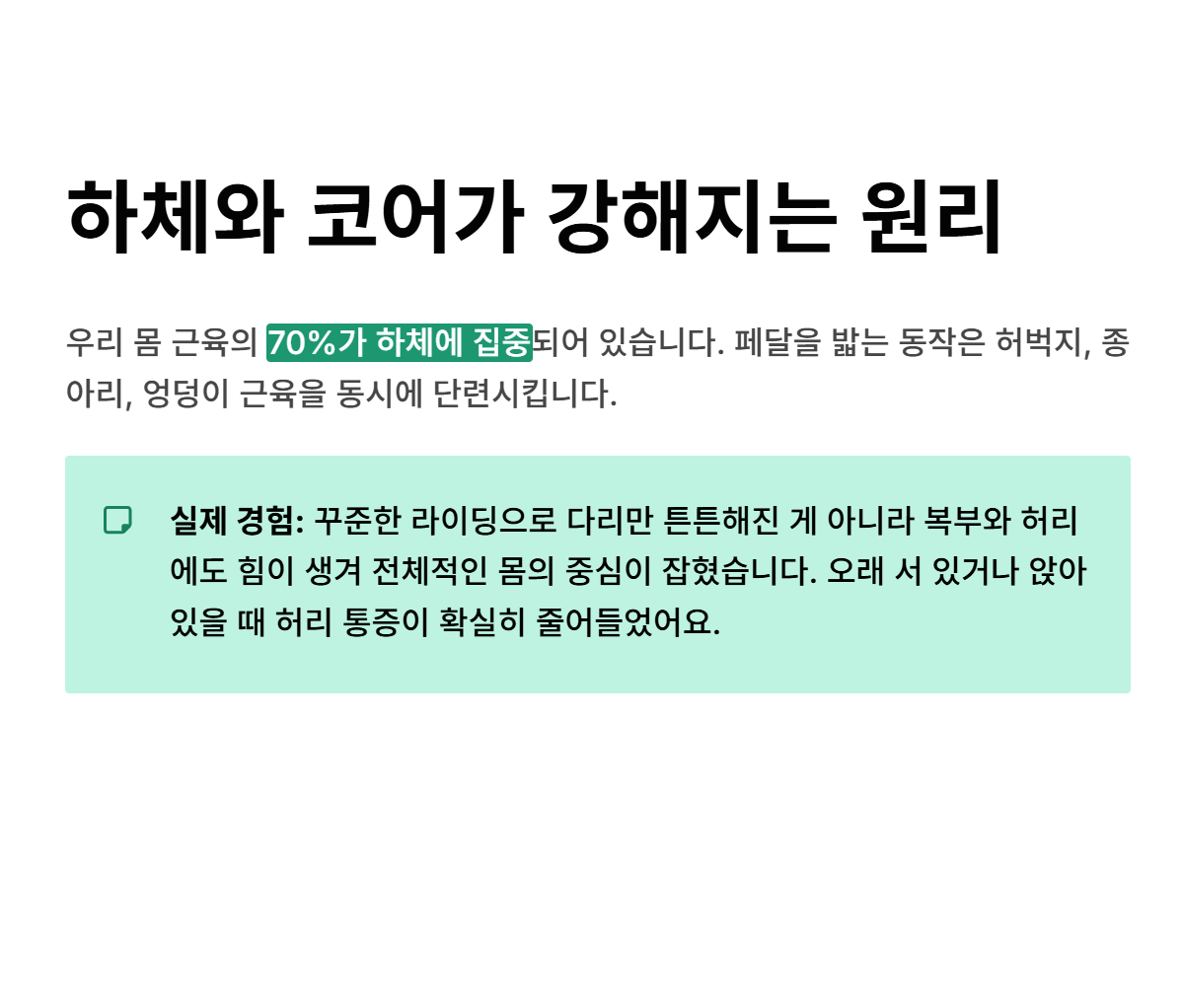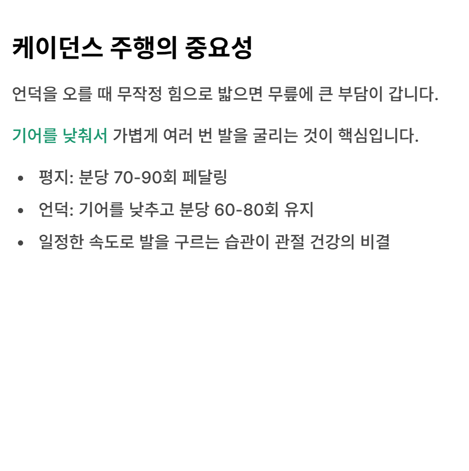 - 관절 건강 증진: 제대로 된 자세로 타면 무릎 주변 근육을 강화해 관절을 보호합니다.