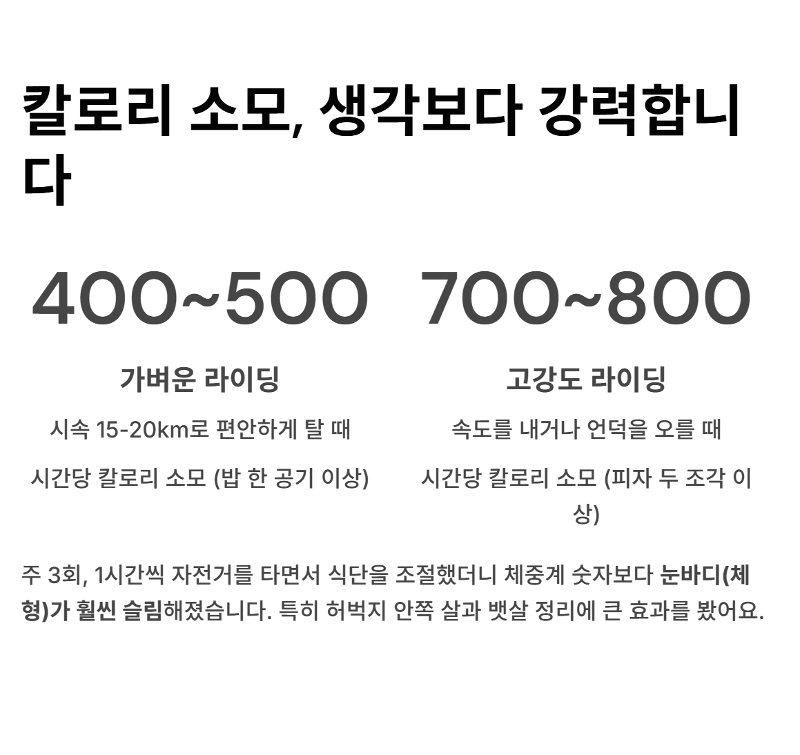 저는 식단 조절과 병행하며 주 3회 1시간씩 자전거를 탔을 때, 몸무게 숫자의 변화보다 눈바디(체형)가 훨씬 슬림해지는 걸 확인했습니다. 특히 허벅지 안쪽 살과 뱃살 정리에 큰 도움을 받았어요.
